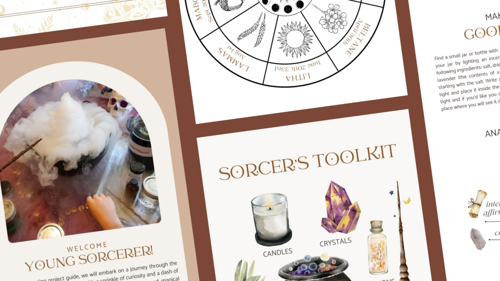 A Young Sorcerer's Guide: Enchanting Projects for Kids contains a variety of magical hands-on activities like fizzy potions, wand crafting, and more to explore the mystic arts and infuse magic into your homeschool. Perfect for spooky season, Pagan families, or children who love fantasy.
